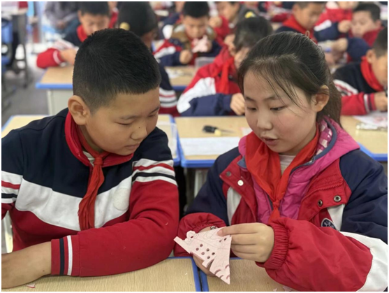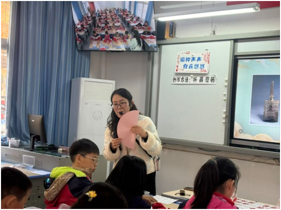 随后,实验小学副校长施圆圆为师生们主讲富有创意的剪纸特色示范课《编钟声声 白云悠悠》。她围绕编钟的历史渊源与白云小学校名“白云”的灵动意象展开讲解,手把手指导孩子们构思、裁剪。小助教们贴心帮助,一张张彩纸在孩子们手中翻飞,化作一个个造型别致的编钟、一朵朵轻盈飘逸的白云。当精美的剪纸作品新鲜出炉时,孩子们眼中满是惊喜与自豪。