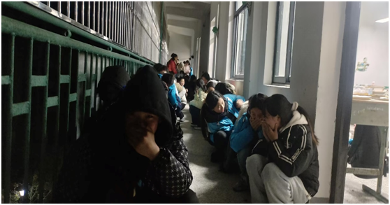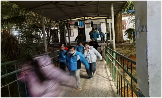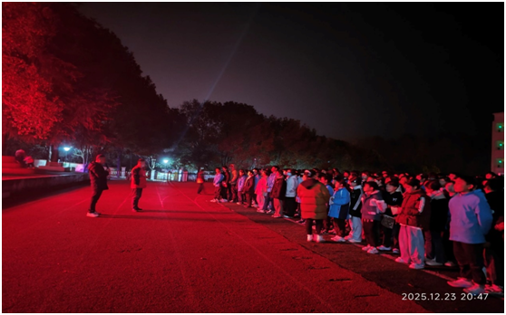 本次演练严格按照学校制定的夜间消防疏散演练预案和方案有序推进。演练信号发出后,全校教职工迅速到岗,履行引导疏散职责。教学楼内的八、九年级学生,以及宿舍楼内的六、七年级学生,在演练疏散引导组人员的指挥下,弯腰低姿、捂住口鼻,沿着预定疏散路线快速、有序地向运动场安全区域撤离。整个演练过程用时2分36秒,疏散时紧张而不慌乱,师生们动作规范、配合默契,高效完成了撤离集结任务。