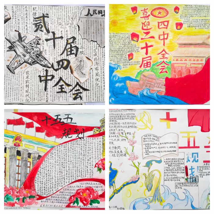 政治组教师结合课堂教学,对二十届四中全会精神的核心要义及“十五五”时期国家发展的方向与重点进行了深入浅出的讲解,为学生创作提供了扎实的理论基础与思想引导。同学们利用课余时间,认真搜集资料,精心构思布局,将所学所思与艺术创意相结合,创作出了一幅幅主题鲜明、图文并茂的手抄报作品。