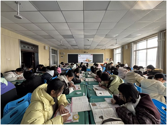 比赛面向七、八年级全体学生,赛事分为初赛与决赛两个阶段。以班级为单位开展选拔,遴选出书写功底扎实的学生进行决赛。决赛规则是现场书写、规定内容、限时完成的形式进行。比赛现场,同学们满怀热情,全神贯注。他们手握钢笔,凝神静气,用心书写每一个汉字。点、横、竖、撇、捺,每一笔都尽显功底;间架、结构、布局,每一划都凝聚巧思。楷书端正秀丽,行书飘逸灵动,一页页整洁的纸张上,不仅呈现出汉字的形体之美,更展现了同学们对书法艺术的热爱与执着。