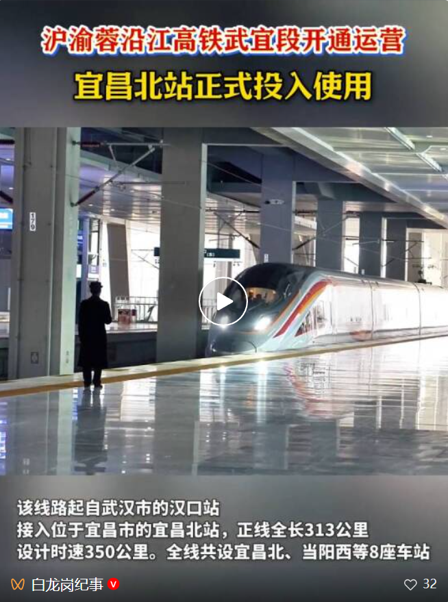 12月26日上午,G6800次列车从宜昌北站平稳驶出,驶向汉口站,标志着沿江高铁武汉至宜昌段(以下简称“武宜高铁”)正式开通运营。