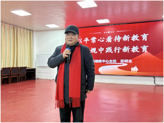 苏明东围绕“以平常心看待新教育,在常规中践行新教育”这一主题发表了指导讲话。他以其对区域教育的深刻洞察,从四个方面为基层教师消除了思想与实践的顾虑:一是阐明新教育并不神秘,其核心是回归教育本真、关注生命成长;二是强调新教育并不可怕,鼓励教师从一小步开始尝试,在行动中理解;三是指出新教育不是额外负担,关键在于与现有常规工作的有机融合、增效提质;四是指导新教育的校本化实践,要求各校结合自身实际,找到切入点,创造性地推进。他的讲话既是对理念的高位引领,也充满了对基层实践的理解与支持,为长岗新教育扎实落地提供了务实而富有智慧的方法论,充分体现了上级对乡镇学校稳步发展的殷切关怀与持续帮扶。