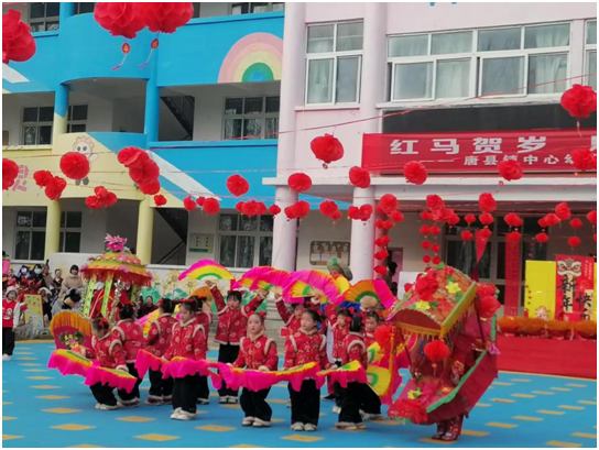 文艺汇演。汇演现场锣鼓喧天,喜气洋洋。《鼓舞雄狮》拉开序幕,萌娃们操控雄狮腾跃摇摆,尽显精气神;腰鼓《开门红》节奏铿锵,红绸翻飞间跳出新年期盼;花操《越来越好》、瓶子器械操《过年啦》与筷子器械操《“筷”乐无边》创意十足,孩子们用灵动动作演绎童真活力;啦啦操《你要跳舞吗》动感十足,非洲鼓《马年大吉》鼓声阵阵;压轴的舞龙、赶毛驴、跑旱船与舞扇子民俗表演,将现场氛围推向高潮,赢得满堂喝彩。