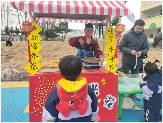 游园庙会。庙会区域热闹非凡,年味十足。套圈摊位前,孩子们屏息瞄准、欢呼雀跃;非遗捏泥人摊位上,小手翻飞间诞生一个个可爱造型;写福字心愿卡区,稚嫩笔触承载着美好期许。冰糖葫芦的酸甜、汤圆的软糯、爆米花的香脆、五谷粥的醇香弥漫校园,让孩子们大快朵颐。两人三足、小脚踩大脚等亲子游戏增进默契,集福换礼环节更让孩子们满载而归,每张笑脸都洋溢着幸福。