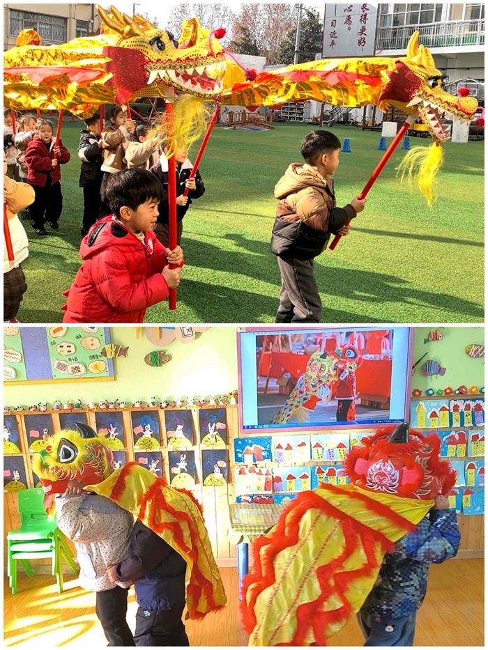 操场上,热闹的气息扑面而来。孩子们十人一组、分工协作,在老师的指导下舞动着五彩长龙,认真练习基本步法与动作。一条条巨龙时而盘旋,时而穿梭,动作稚嫩却充满童趣。另一边,小朋友们头戴特制小狮头,模仿着醒狮的神态,摇头晃脑、憨态可掬,可爱模样引得阵阵欢笑。