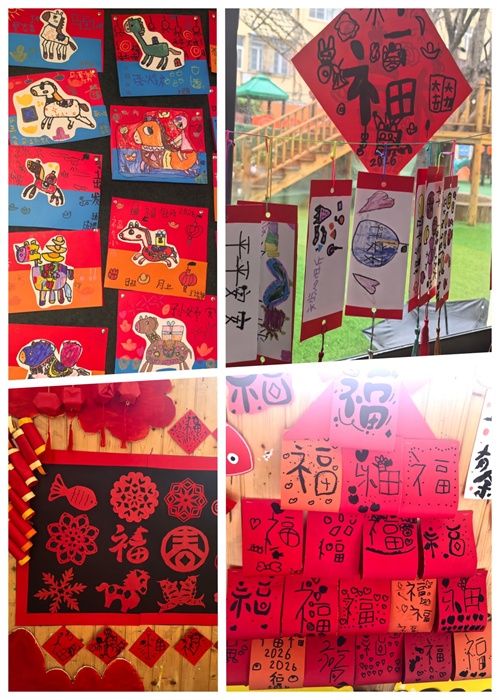 教室里,温馨的画面映入眼帘。孩子们在老师的带领下忙得不亦乐乎:制作鞭炮、写对联、画彩马,贴福字,一双双小手专注又灵巧。“看!这是我们班小朋友贴的福!”稚嫩的话语里满是自豪。就连小班的宝宝们也不甘示弱,忙着粘果果、拓福画,将教室装扮一新。这些手工活动,不仅锻炼了孩子们的动手能力,更让他们在亲身参与中理解了新年习俗的文化内涵。