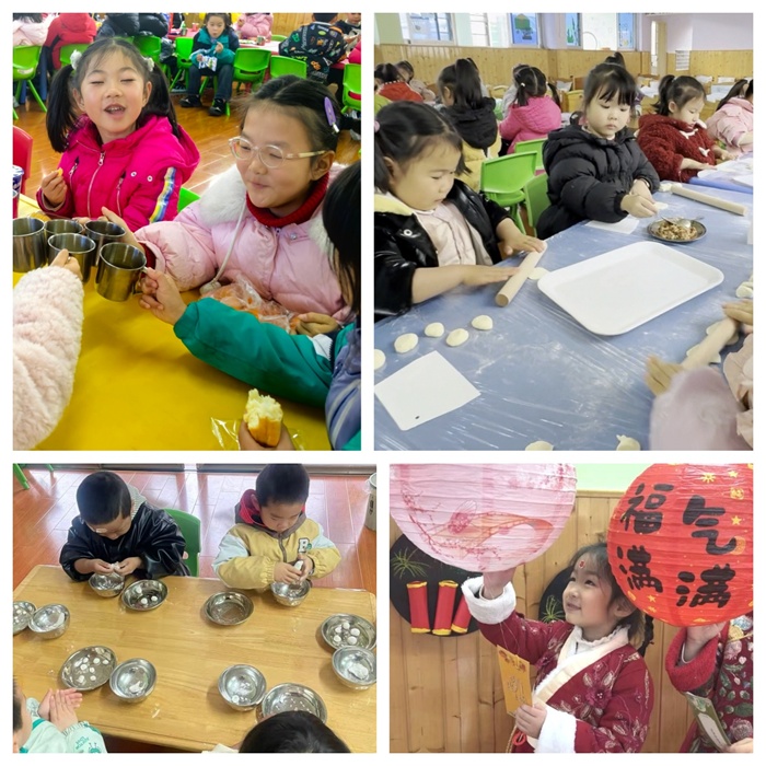 欢乐的氛围里,当然少不了暖心的美食分享环节。老师带着孩子们一起擀面皮、包饺子,虽然包出来的饺子形状各异,但每一个都裹满了童真与创意。“我们自己包的饺子最好吃!”孩子们捧着碗吃得格外香甜。有的班级还围坐在一起,品尝着热乎乎的水果茶、汤圆。老师一边陪着孩子们分享美食,一边讲述着食物里的美好寓意,将饮食文化与节日教育巧妙融合。