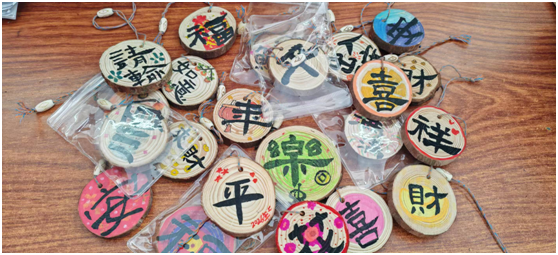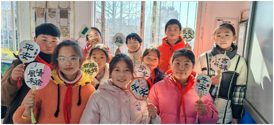 在木质挂牌和纸质扇面上,同学们挥毫书写“前程似锦”“万事顺遂”“阖家幸福”等祝福话语,一笔一划间尽显认真,稚嫩的笔触里藏着对新年的憧憬。