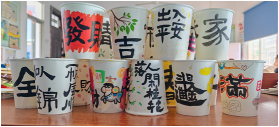 活动中,同学们化身“小小书法家”,在老师的指导下,用毛笔、马克笔等工具,将新年的美好期许融入书法创作。在纸杯上,他们写下“平安”“吉祥”“发财”等喜庆字样,搭配五彩的绘画装饰,普通的纸杯变成了独具韵味的新年文创。