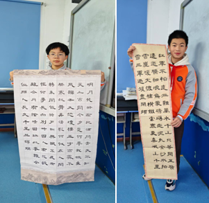 除了创意书法创作,学校还组织了经典诗词书法展示活动。学生们以隶书字体书写《水调歌头•明月几时有》、《七律•长征》等经典篇目,一幅幅作品或端庄工整,或刚劲有力,展现出扎实的书法功底和对经典文化的理解。