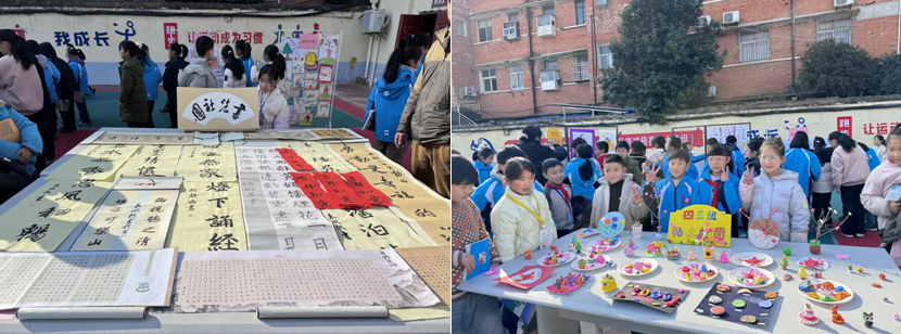 篮球场周边的成果汇报区,同样洋溢着全员参与的浓厚氛围。简笔画、水彩画、剪纸、粘土、十字绣等作品琳琅满目,展板上的每一笔色彩、每一件手作,都出自社团成员之手。从低年级的稚嫩创作到高年级的精致作品,人人有作品,班班有亮点,每一份成果都是日积月累的成长印记,尽显学生的创造力与专注力。