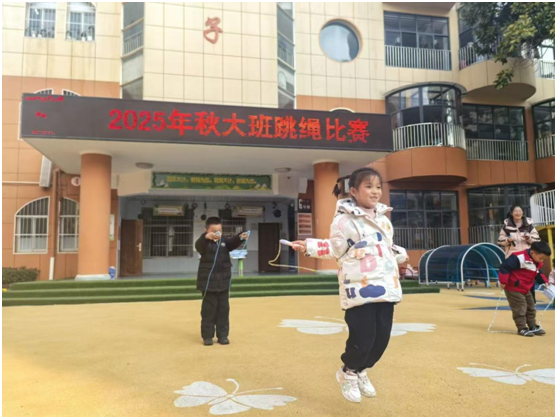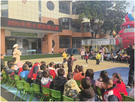 作为该园“萌娃乐动”特色体育活动的重要组成部分,本次跳绳比赛以单人竞速为核心,旨在通过趣味竞技激发幼儿的运动潜能。比赛现场气氛热烈,小选手们个个精神饱满、跃跃欲试。随着一声令下,彩色的跳绳在孩子们手中飞快舞动,双脚轻盈跳跃,小小的身影在金色的操场上划出一道道灵动的弧线。有的孩子节奏稳定、动作娴熟,一分钟内连跳百次;有的孩子虽稍显紧张,但仍坚持不懈,在同伴的加油声中不断突破自我。场下的小观众们也热情高涨,挥舞着小手为参赛伙伴呐喊助威,欢笑声、加油声、跳绳拍打地面的哒哒声交织成一曲欢快的运动乐章。