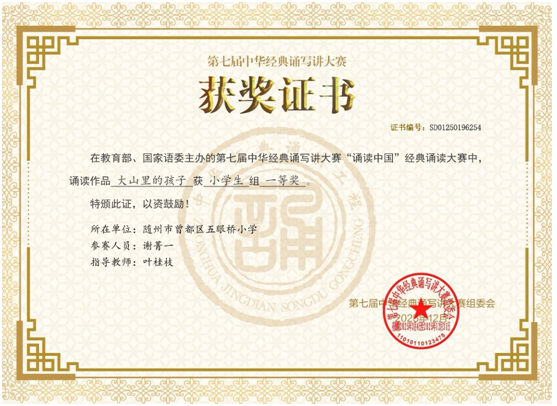 随州新闻网讯 (通讯员汪玲、叶桂枝)1月13日,由教育部、国家语委主办的第七届中华经典诵写讲大赛“诵读中国”经典诵读大赛获奖名单公布,曾都区五眼桥小学谢菁一同学凭借作品《大山里的孩子》,斩获全国一等奖。