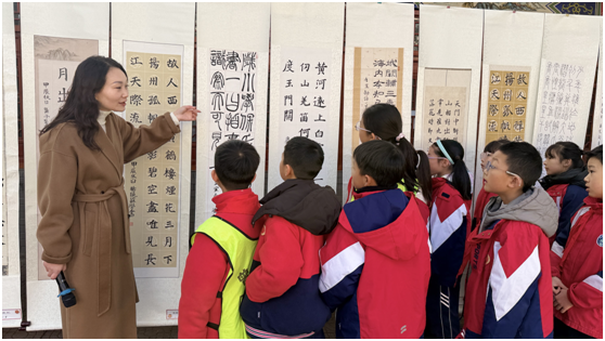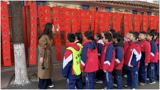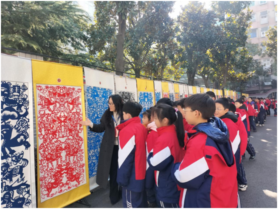 进入展区,感恩路、筑梦路两侧集中展示学生书法与剪纸作品,现场悬挂的春联营造出浓厚的喜庆氛围。学校副校长刘丹、施圆圆正向师生介绍书法和剪纸作品特色及课程开展情况,引导学生感受传统文化魅力,增强文化认同。
