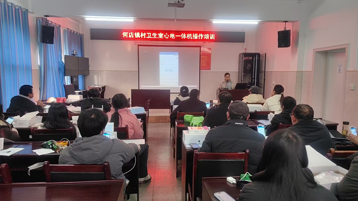 村医赋能,贯通服务末梢。院内培训结束后,黄雷随即对全镇村卫生室乡村医生开展集中培训,系统讲解设备操作流程、常见异常心电图特征识别要点及危急值报告与转诊机制,并同步开展现场实操指导,确保村医听得懂、学得会、用得上。