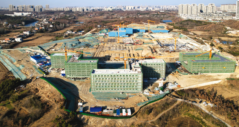 随州市第二高级中学迁建项目有序推进,两栋宿舍楼已经封顶,教学楼、实验楼、食堂等建筑正在施工中。图为近日施工现场航拍。