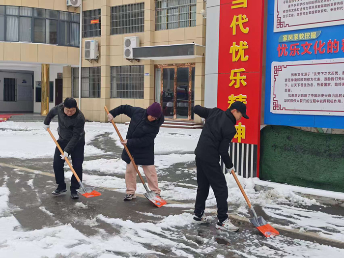 1月20日,学校领导班子、党员干部率先垂范,携手校内住户积极开展校园铲雪除冰行动。他们不畏严寒,挥锹奋战,为师生安全复课清扫道路、消除隐患。这一行动不仅保障了校园通行安全,更以实际行动诠释了无私奉献、团结协作的文明风尚,展现了岁丰人高度的责任意识与深厚的校园情怀。