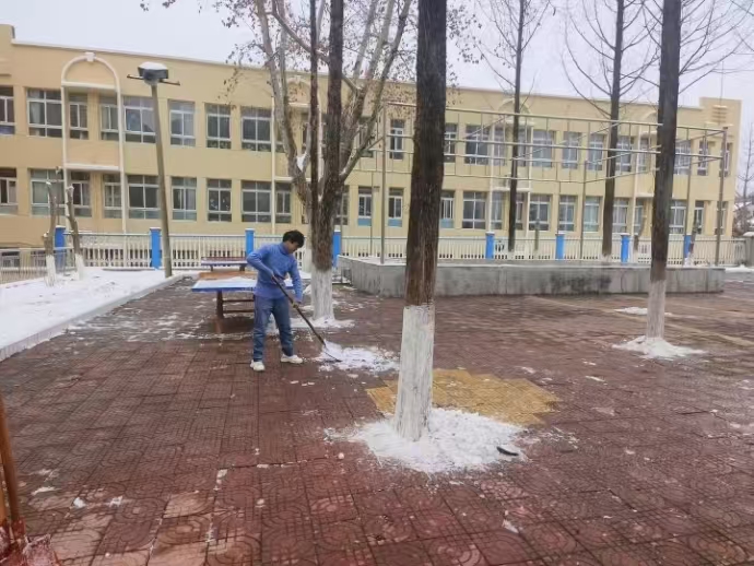 此前,低温冰雪天气导致校园内路面结冰、部分设施受冻,给复学安全带来挑战。学校第一时间部署工作,明确分工压实责任:由分管卫生的负责人马主任牵头划分责任区域,确保校园内教学楼、操场、走廊、楼梯、校门口等关键区域全覆盖,无管理盲区。下午教职工返校后,立即按照她的安排,手持铁锹、扫帚等工具投入除雪铲冰工作。大家不畏严寒、分工协作,有的铲除路面坚冰,有的清扫残留积雪,有的清理角落积雪堆积处,始终坚持“不留死角、不留隐患”的原则,对每一处通行区域进行彻底清理,确保学生返校路径畅通安全。