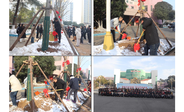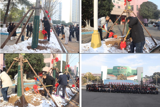随后的植树环节热闹而有序:系着红绸的铁锹递至手中,银发苍苍的退休教师弯腰铲土,落雪裹着新泥沾上衣角,却挡不住眼底对校园的眷恋;青年教师与学生们分工协作,或培实新土筑牢根基,或踮脚为树苗系上“70周年校庆纪念”挂牌,笑声裹着晴光漫过凤凰大道。一株株新苗在支架扶持下挺立,红绸轻拂绿枝,成为校庆系列活动中最具生机的起笔。