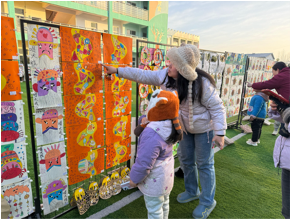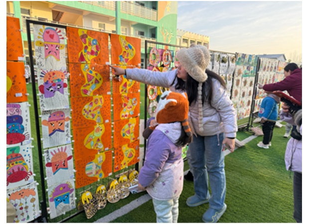 活动现场亮点纷呈,幼儿作品展示区里,绘画、手工、泥塑、建构等作品琳琅满目,每一件都饱含童真创意。家长们驻足观赏,认真聆听孩子讲解作品背后的故事,真切感受孩子的点滴进步。