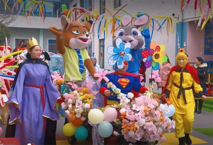 上午9:30,伴随着欢快的动画片音乐,童话王国的序幕正式拉开。操场上,各班亲子共同设计制作的创意花车依次排列,由幼儿园教师精心装扮的首辆花车率先出发,引领着这支充满童趣的队伍。孩子们有的扮成勇敢的艾莎公主,有的变身帅气的敖丙,还有小小孙悟空挥舞着金箍棒……他们用稚嫩而认真的动作展示着角色魅力。现场大屏幕同步播放着各个家庭制作花车时的花絮视频,这些温馨画面让许多家长露出了感动而自豪的笑容。园长在致辞中表示:“我们希望通过这样特别的方式,为孩子们本学期的成长画上一个快乐而难忘的句号。”