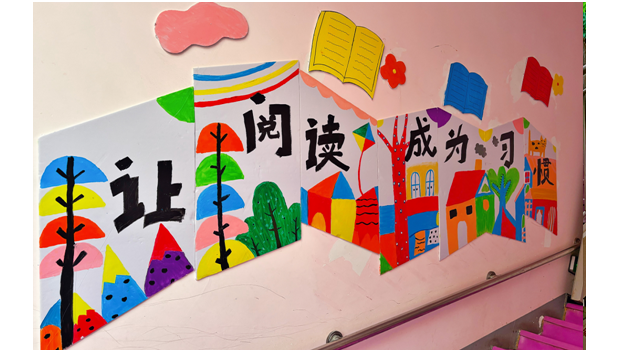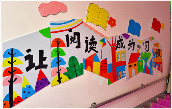 教师们充分发挥专业功底与巧思,利用KT板、无纺布、卡纸、粘土等多种材料,精心布置。从入口处的“故事森林”启程,楼梯墙面呈现经典绘本画面,转角设有“故事休息站”与角色玩偶,直至顶部呈现“让阅读成为一种习惯”的温馨寄语,一步一景,构筑出一个立体、沉浸的阅读空间。