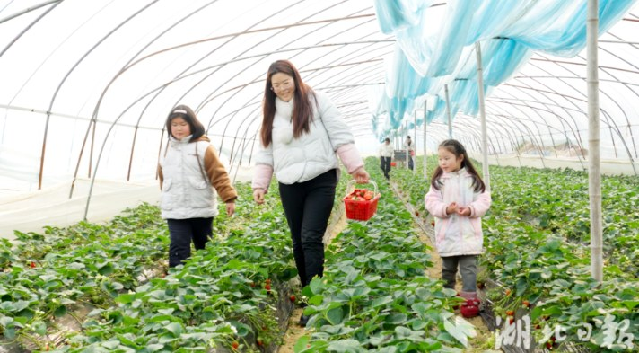 “又鲜又甜,个头还大,我们摘得很开心!”近日,广水市蔡河镇机场村机场草莓园里,游客叶静一边指导孩子采摘,一边展示手中的成果。