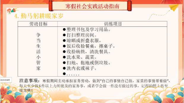 为让孩子们度过一个充实、有意义的寒假,班主任结合孩子个性特点给出个性化规划建议:鼓励家长与孩子共同制定阅读计划,让每日阅读成为习惯,提升阅读理解能力;布置力所能及的家务小任务,在实践中培养孩子生活自理能力;一同参与春节传统习俗活动,让孩子在动手体验中传承传统文化,增进家庭凝聚力。