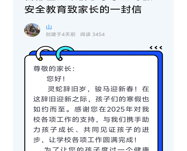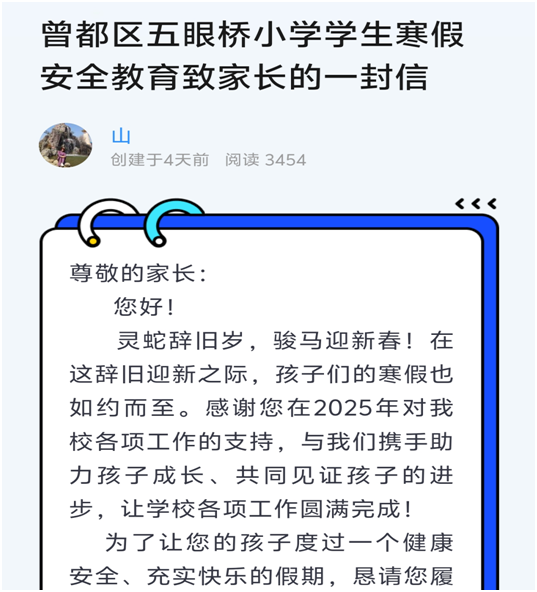 深化家校协同,致函凝聚合力。为压实家长寒假监护责任,构建家校共育安全格局,学校向全体学生家长发放《中小学寒假安全温馨提示》《中小学寒假安全责任告知书》《曾都区五眼桥小学学生寒假安全教育致家长一封信》。信函中明确家长在假期中的监护职责,详细列出交通出行、居家防护、外出活动、网络使用等方面的安全提示,特别提醒家长加强对孩子的日常监管,关注孩子心理健康,引导孩子健康上网、文明上网,防范电信网络诈骗和校园欺凌等风险。