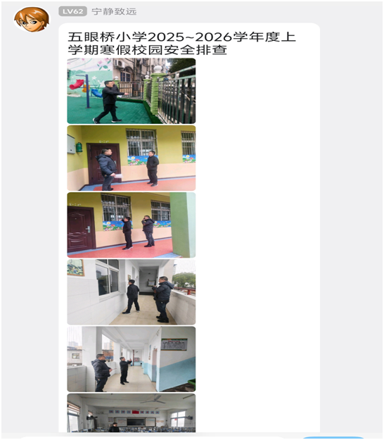 校园安全无终点,寒假防护不松懈。曾都区五眼桥小学以高度的责任感和使命感,扎实推进寒假安全管理各项工作,既强化学生安全意识,又凝聚家校共育合力,切实消除安全隐患。寒假期间,学校将持续关注学生动态,常态化开展安全提示,不断完善安全管理长效机制,为学生健康成长营造安全、和谐、文明的育人环境,为优化营商环境贡献教育力量。