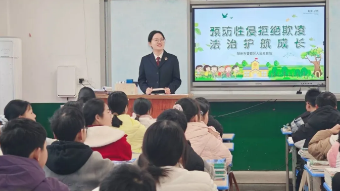 “普法进校园”首站在府河镇初级中学正式开讲,检察人员结合正处于青春期孩子的心理特点,采用“案例剖析+情景模拟+互动问答”的形式,将法律知识融入真实案例与趣味互动中,告诉孩子们如何正确防范侵害、拒绝校园霸凌等知识。