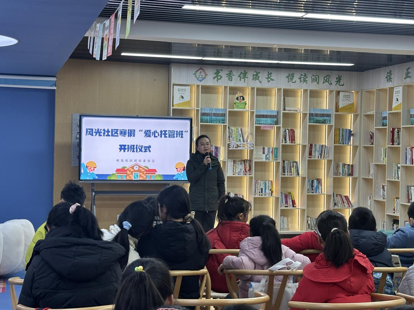 开班仪式现场暖意融融,志愿者们提前到场筹备,微笑迎接每一位孩子,耐心引导签到、熟悉场地,温馨氛围快速驱散了孩子们的陌生感。风光社区党委书记张艳向各位志愿者的辛苦付出和家长们对社区的信任表示诚挚感谢,寄语小朋友们在托管班度过一个充实有意义的假期。她表示,爱心托管班是社区“为民办实事”的重要举措,始终以关爱孩子、服务居民为宗旨,全力为孩子们打造安全、充实、快乐的假期成长空间。