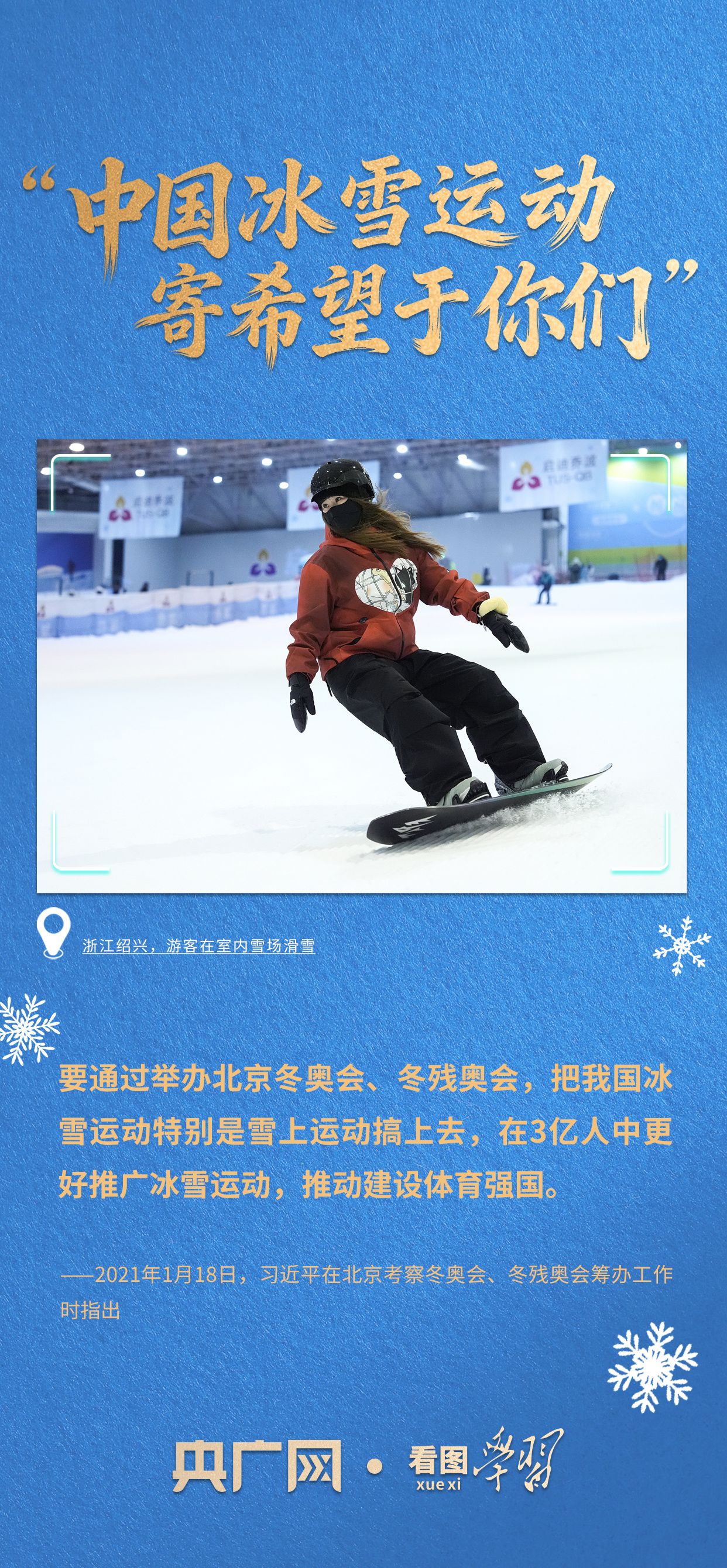 2021年1月,总书记在河北省张家口市崇礼区考察调研时指出,中国冰雪运动也必须走科技创新之路,一方面要坚持自主创新,一方面要善于吸收国际上的先进技术和训练方法。