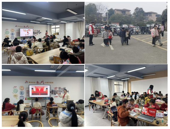 课堂上,有“干货满满”的成长赋能:文明养犬与自我保护、反电信诈骗、勤俭节约倡导等主题课程,通过视频观看、PPT讲解与互动问答,让安全知识与正向价值观扎根心底;社会主义核心价值观宣传教育、家风家教分享,引导孩子们树立正确的人生导向。在实践中,趣味体验“动手动脑”:个性名牌手工、春节剪纸创作、马年主题绘画,孩子们用双手勾勒创意,感受传统与艺术的魅力;清洁家园文明实践活动中,大家化身“环保小卫士”,用行动践行爱护环境的理念;趣味运动会上,拔河、两人三足等项目让孩子们在协作中收获友谊,在欢笑中增强体质。
