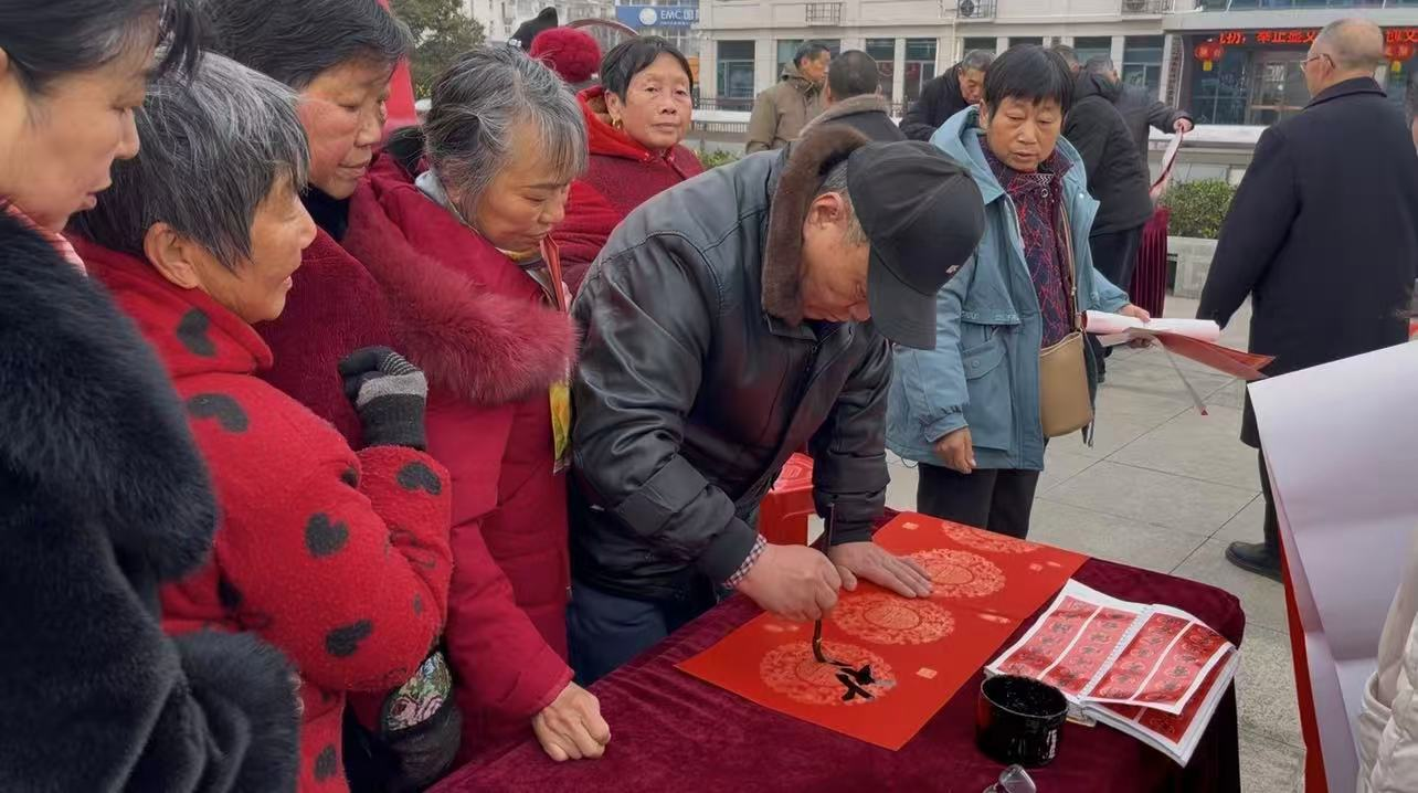 送春联环节,书法爱好者现场铺纸研墨、挥毫泼墨,一副副饱含新春祝福的春联跃然纸上,刚写好的春联被居民争相领取,把浓浓的年味和美好祝福送到大家手中。