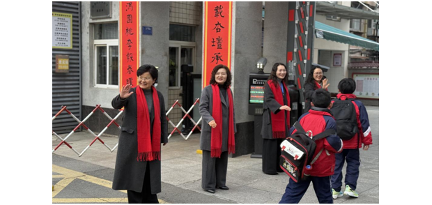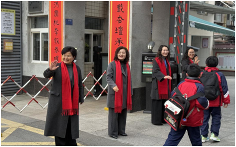 在校门口,校长、老师们与礼仪志愿者微笑相迎,用亲切问候与温暖拥抱迎接每一位学子归来。