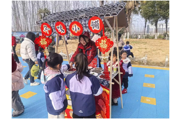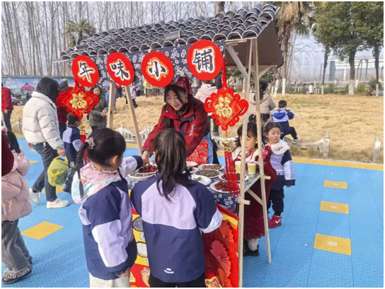 新学期的第一份欢喜,藏在热闹的年味小铺里。砂糖橘、花生、瓜子、各式糖果整齐摆放,孩子们自主挑选、快乐分享,在欢声笑语中延续春节的喜庆与温暖。小小的摊位,是社交的小天地,是分享的启蒙课,让开学的仪式感满满当当。