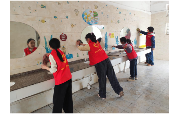 活动中,小志愿者们分工明确、干劲十足。大家手持抹布、扫帚、垃圾袋等工具,认真投入劳动:在校园厕所,队员们细心擦拭墙壁、清洁宣传画、拖洗地面,不放过一处污渍、不留一个卫生死角;在校园花坛,大家弯腰俯身,仔细捡拾有色垃圾,耐心清理花箱周边杂草,让校园绿化区域更整洁美观。