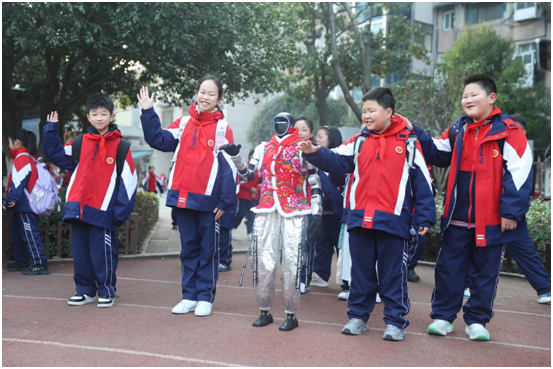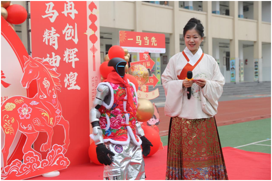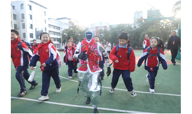 科技赋能未来,创新点亮童年。宇树科技春晚同款智能机器人“恩雅”惊喜登场,名字取自学校“感恩教育”与《诗经•小雅》,寓意深厚。“恩雅”与同学们亲切互动,带来流畅灵动的武术、太极、拳法与舞蹈表演,精准动作与可爱神态引爆全场,掌声与欢呼此起彼伏。这一沉浸式科技体验,让同学们近距离感受人工智能魅力,在心中播下热爱科学、勇于探索的种子。