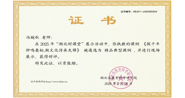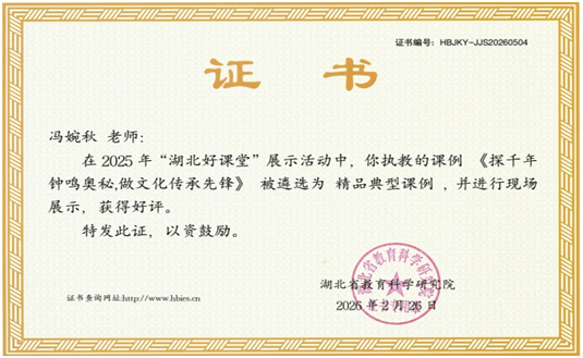 在湖北省2025年“湖北好课堂”典型课例评选中,我校冯婉秋老师凭借扎实的教学功底与创新的课程设计脱颖而出,其执教的《探千年钟鸣奥秘,做文化传承先锋》获评初中道德与法治精品典型课例,并受邀参加省级现场展示,充分彰显学校思政课程建设的过硬实力。