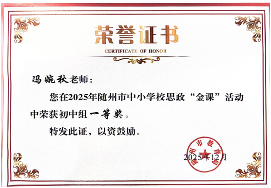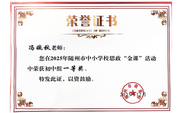 在随州市级思政教学评比中,该校教师团队同样表现亮眼。2025年随州市中小学思政“金课”活动里,冯婉秋老师斩获初中组一等奖。 在随州市初中道德与法治“随州好课堂”评选中,冯婉秋、汪雪、张鑫三位老师分别凭借《探千年钟鸣奥秘,做文化传承先锋》《学会管理情绪》《探寻文物中的团结密码》课例,摘得一、二、三等奖。