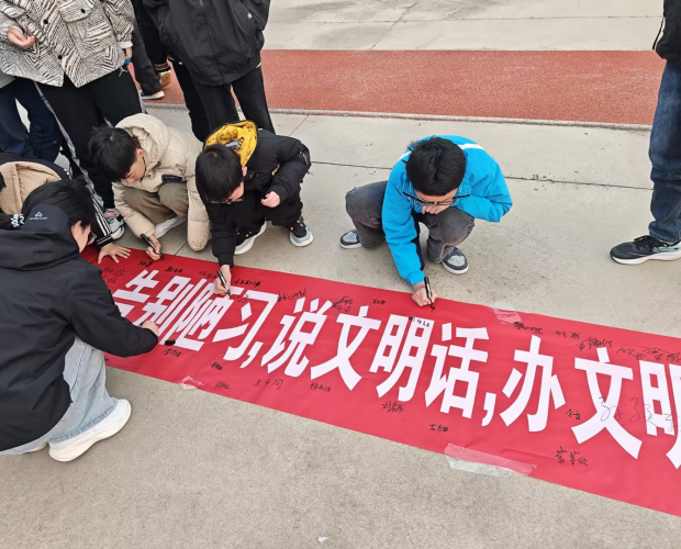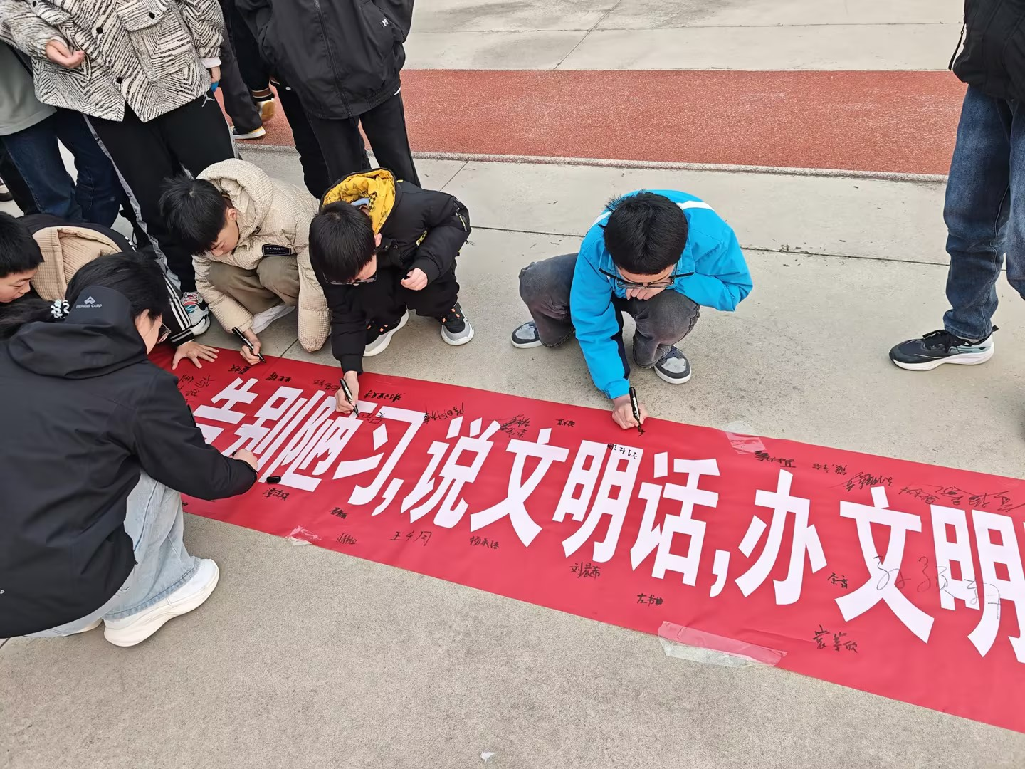 生代表发出倡议,号召从问好、守序、护绿等小事做起,让文明内化于心、外化于行。在主题横幅前,同学们有序签名,落笔即是践行文明的庄重承诺。学校本月将开展主题班会、文明标兵评选等活动,推动文明礼仪融入日常,共建和谐校园。