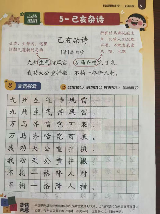 随州新闻网讯(通讯员吴梦阳)翰墨润心,琢字育人。为深入践行新教育十大行动之书香校园建设,传承中华优秀传统文化,全面落实书法教育教学要求,践行学校“琢文化”育人理念,在随县小学语文程飞雪名师工作室的引领下,随县烈山湖学校精心组织寒假书法实践活动,以《诗词趣练字》为核心载体,引导全体师生坚持练字,夯实书写基础,以笔墨涵养品格,以书写助力成长。