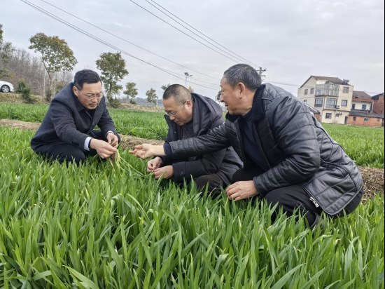 3月4日,湖北省农科院粮作所来到金花岭村,开展“科技闹春耕”活动,指导农户应对极端天气后的田间管理(如图)。“小麦返青拔节期要防范‘倒春寒’,不同田块要分类施策。”专家的现场指导,让农户们吃下定心丸。