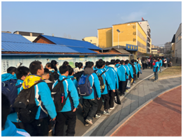 快静齐准,彰显规范。 随着下课铃声响起,各班迅速响应。教室门前,学生们在班干部指挥下安静列队,做到"快、静、齐";楼道转角,队伍自动成两列纵队,前后间距适中;行进途中,同学们昂首挺胸、步伐一致,洪亮的班级口号响彻校园。低年级学生虽个头小小,却毫不示弱,紧紧跟随领队,稚嫩的脸上写满认真;高年级学长学姐则展现出沉稳干练的气质,队形如直线般笔直延伸。