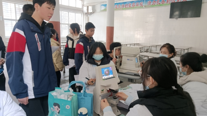 按照学校统一安排,七、八、九年级学生分批依次进入检测区域。身高体重测量区,医务人员耐心指导学生正确站立,精准记录每一组数据——这些数字不仅是生长发育的印记,更为后续营养评估和身体状况提供了科学依据;视力检测区,专业验光师使用标准对数视力表,仔细检查学生裸眼视力,对视力异常者详细询问日常用眼习惯,并给予专业建议。班主任全程跟班,引导学生有序参检,现场秩序井然。