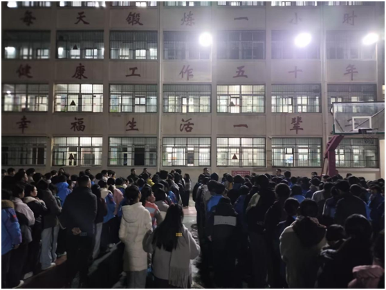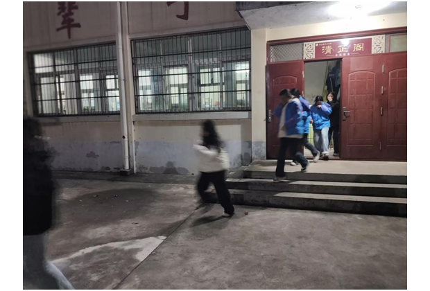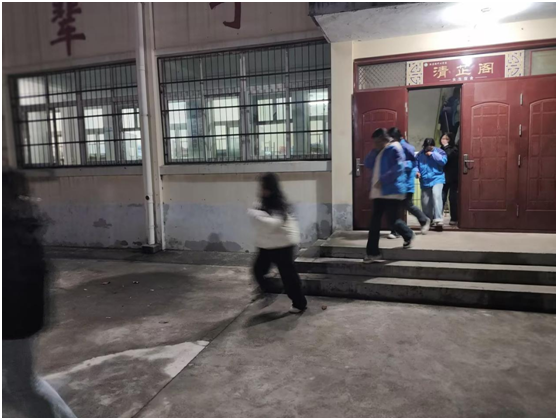 当晚20时40分,随着急促的哨声响起,演练正式启动。全体师生迅速反应,各楼层负责教师第一时间到位,引导学生按照预定路线有序撤离。学生们左手捂鼻、右手扶墙、弯腰弓行,沉着冷静地从寝室沿楼道快步前行,短短3分钟内,全部安全集结至篮球场。整个疏散过程组织有序、行动迅速、配合默契,充分展现了师生良好的应急素养和纪律意识。