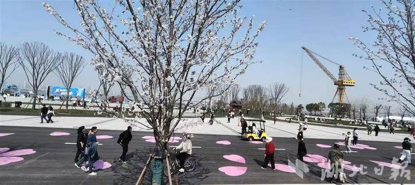 汉马终点站樱花长廊提前开放,4万市民游客尝鲜打卡。
