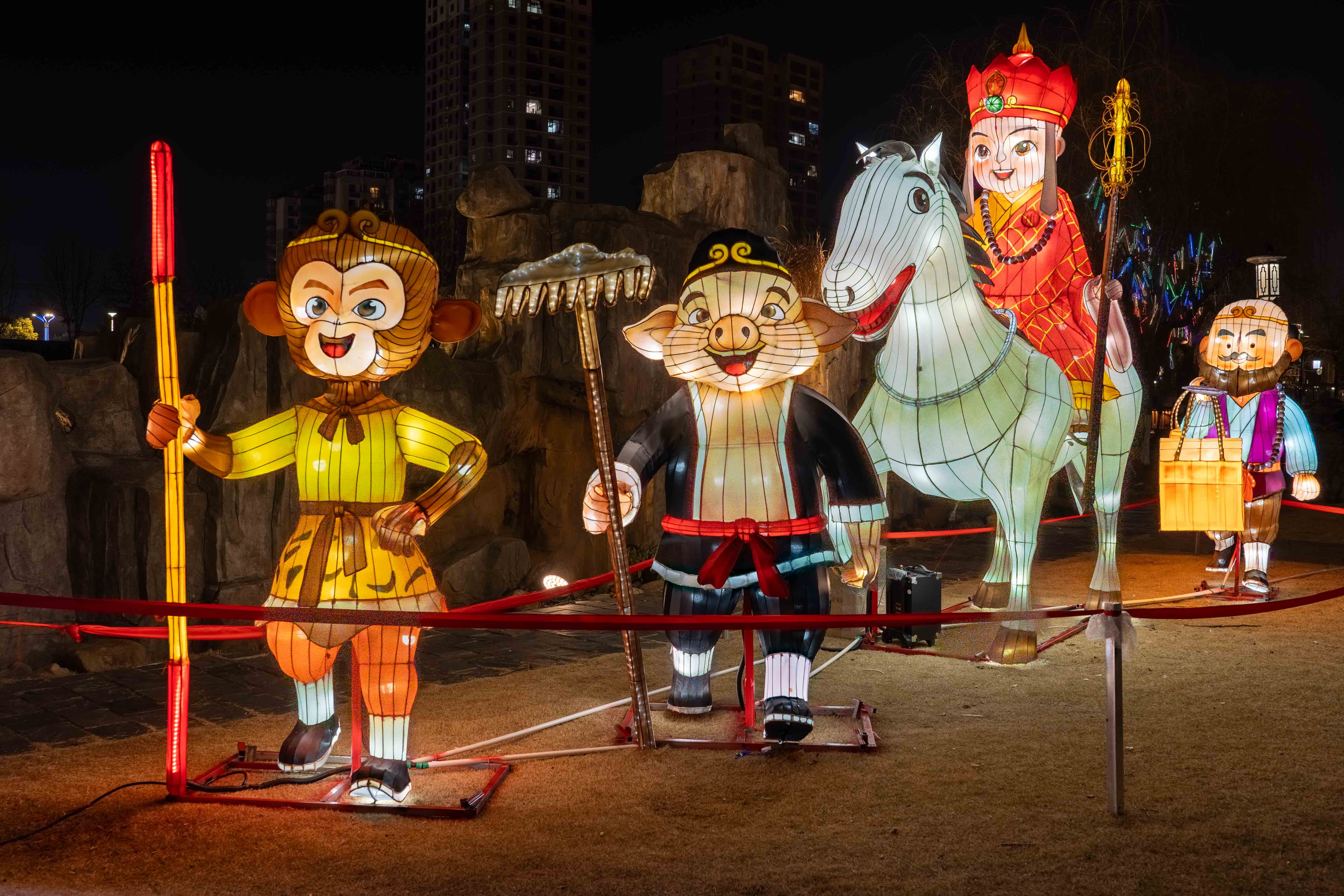 每当夜幕降临,沿广济时光景区2公里中轴线铺展开来的10组西游文化主题大型灯组次第亮起。孙悟空举棒向天、唐僧策马前行、猪八戒憨态可掬——这些陪伴了几代中国人的经典形象,在广济时光景区被光影重新诠释,仿佛从《西游记》的字里行间跳脱而出,活灵活现。
