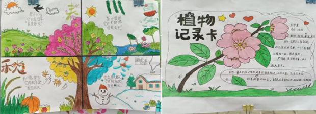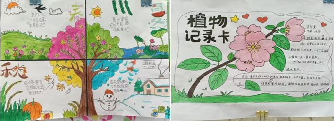 展览现场,一份份充满童趣的作品吸引了众多师生驻足观看。一年级的小朋友们以画笔为媒,创作了四季插画和“形声字乐园”,色彩鲜艳、构思天真;二年级同学围绕“春天”主题,用燕子、花草等元素描绘出生机盎然的春日画卷。三年级学生化身“小小观察家”,通过图文并茂的记录卡,细致描摹桃花、荷花、薄荷等多种植物,展现出敏锐的自然观察力。